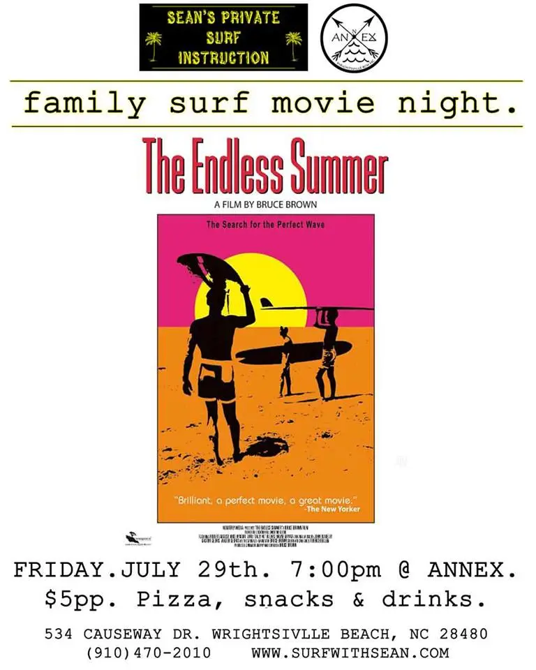 Our next Family Surf Movie Night is coming up soon and it’s a special one for sure!  The cult classic Endless Summer by Bruce Brown will be showing over pizza, snacks and drinks at our shop/ANNEX SURF SUPPLY; 534 Causeway Dr. Wrightsville Beach, NC on Friday, July 29th at 7pm.  Tickets are only $5 including food and can be picked up at the same location.  Don’t miss out on this epic evening of cinematic surfing history and glorification!  I can never watch Endless Summer too many times; love it!