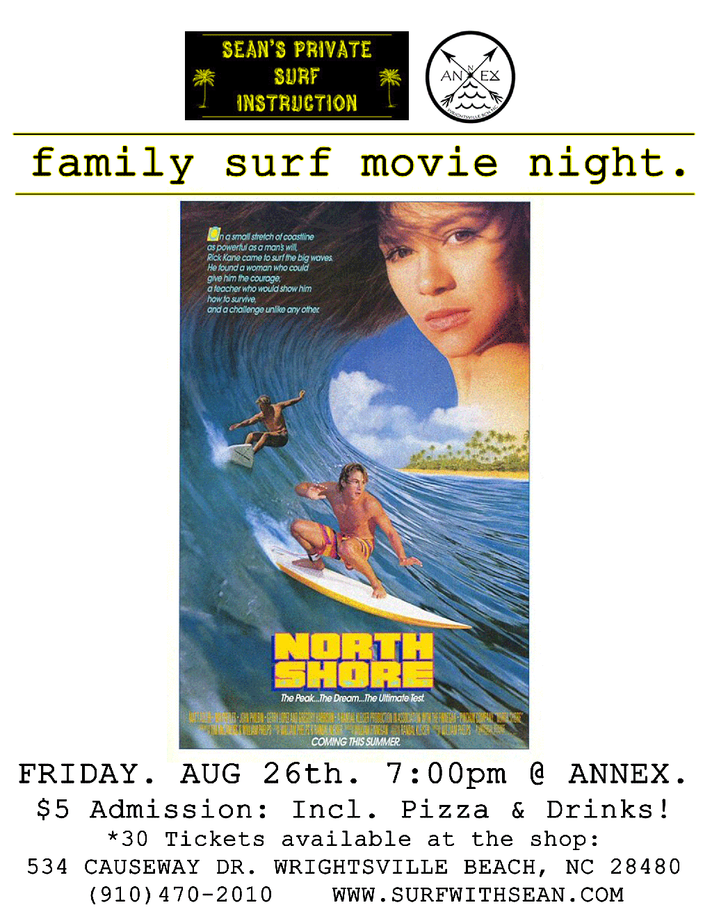 DON’T MISS OUT ON THIS FRIDAY’S FAMILY SURF MOVIE NIGHT AT ANNEX SURF SUPPLY IN WRIGHTSVILLE BEACH & WILMINGTON, NC AREA!  ‘NORTH SHORE’ IS AN ABSOLUTE CLASSIC 80’S MOVIE BASED ON A HAOLE FROM ARIZONA TRYING TO MAKE IT OUT ON THE INFAMOUS NORTH SHORE OF OAHU, HAWAII.  THIS MOVIE IS EPIC AND YOU DON’T WANNA MISS THIS FUN EVENING OF FAMILY, FRIENDS, PIZZA, AND FUN.  START TIME IS 7PM.  THERE ARE ONLY 30 TICKETS AND THEY’RE $5 PP.  HOPE TO SEE Y’ALL THERE!